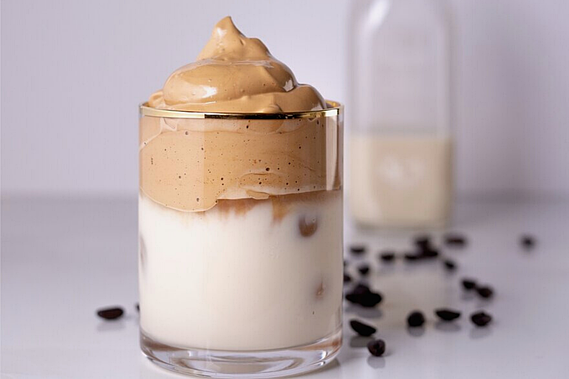 En un vaso llena una cuarta parte con hielo y vierte leche o bebida vegetal hasta completar ¾ partes del vaso. Por último, con ayuda de una cuchara, coloca cuidadosamente la espuma de café sobre la leche. Si lo deseas puedes espolvorear un poco de cacao en polvo, canela o decorar con sirope de caramelo. ¡A disfrutar!